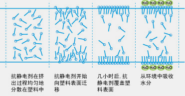 在擠出過程中加入到聚合物中,使其均勻分布在聚合物內,待加工成型后,抗靜電劑分子借助聚合物分子的鏈段運動而向表面遷移,吸收空氣中的水分,形成均勻導電層,來消除靜電。當塑料表面的抗靜電層缺失或損壞時,內部的抗靜電劑分子可以繼續(xù)向外遷移補充,所以具有較持續(xù)的抗靜電效果。
